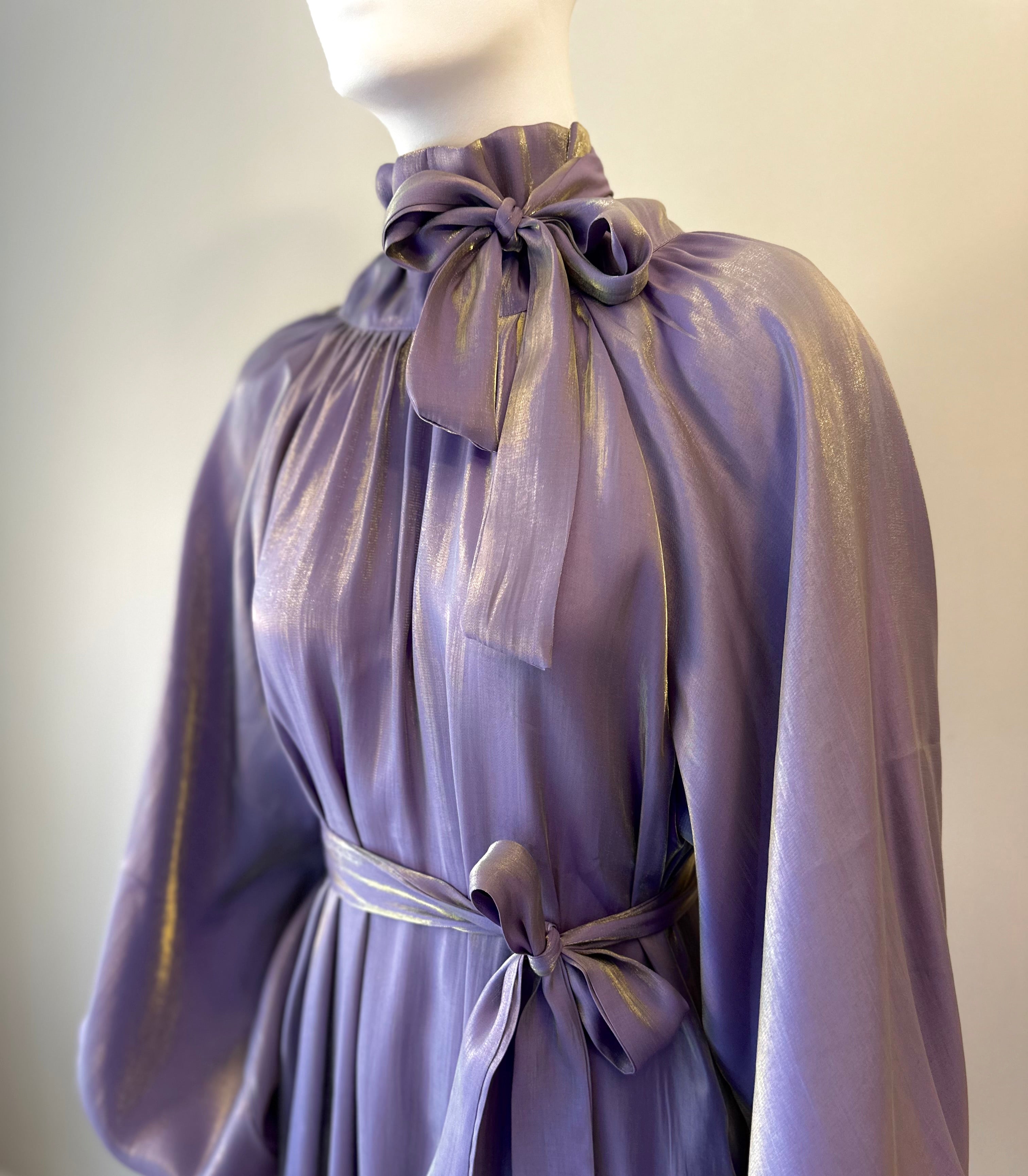 En nydelig kjole som virkelig skiller seg ut. Den har lange, vide ermer, høy hals med sløyfe som man knyter selv og et løst belte i livet som gir en feminin fasong. Stoffet faller lett og gir et elegant uttrykk.